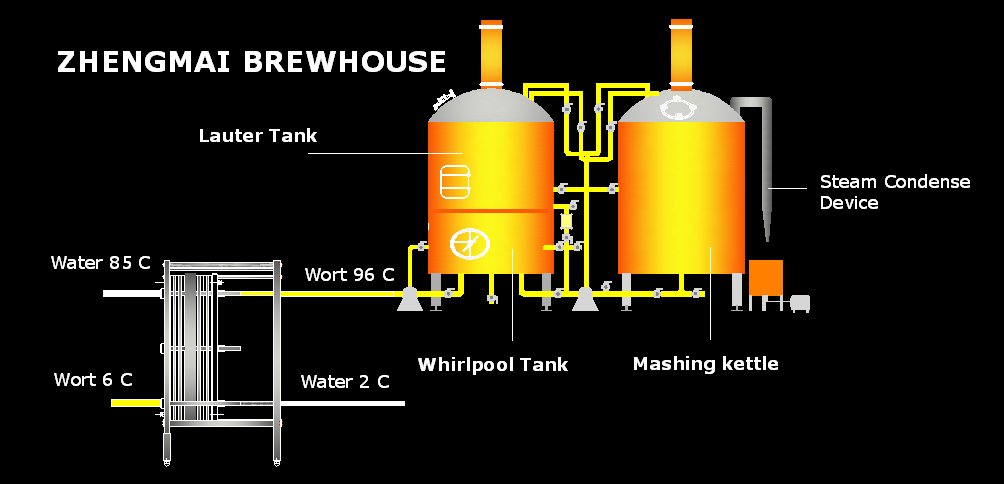 Heating of two brewhouse tanks is provided by steam through side and bottom , the hot water abstracted from the wort coller can be transfered tothe hot water tank and also can be as the lauter spraying water to save the energy . Wort cooling is done in stainless steel one level palte coolerwhich is a part of the brewhouse .