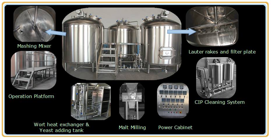Brewhouse consists of two vessels creating one unit together with platform , staircase ,control panel , hot liquor tank , piping and plate wort cooler .Kettle ( the left tank ) has the following functions : mash mixing ,mashig and lautering , it is mashing and to separate the wort from grains ,the boilikng / Whirlpool tank ( the left tank ) can be as the whirlpool and boiling function . The brewhouse can brew the beer 3 time maximumly , which can save the time .