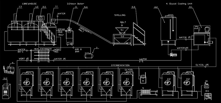 1. Brewhouse, 1.1 Brewhouse: Mash tun, 1.2 Brewhouse: Lauter tun 1.3 Brewhouse: Whilrpool tank ( hot liquor tank)1.3 Cold water tank, 2. Fermentation, 2.1 Fermentation tanks, 2.2 Serving tanks, 3. Steam generator, 4. Glycol cooling unit , 5.Milling, 5.1 Mill, 5.2 Malt grist storage tank, 5.3 Stairs, 5.4 Spiral auger, 6. Portable CIP System, 7. Compressor, 8. Yeast tank, 9. Beer filter, 10. Dispensing, 10.1 KEG filling, 10.2 Draught.