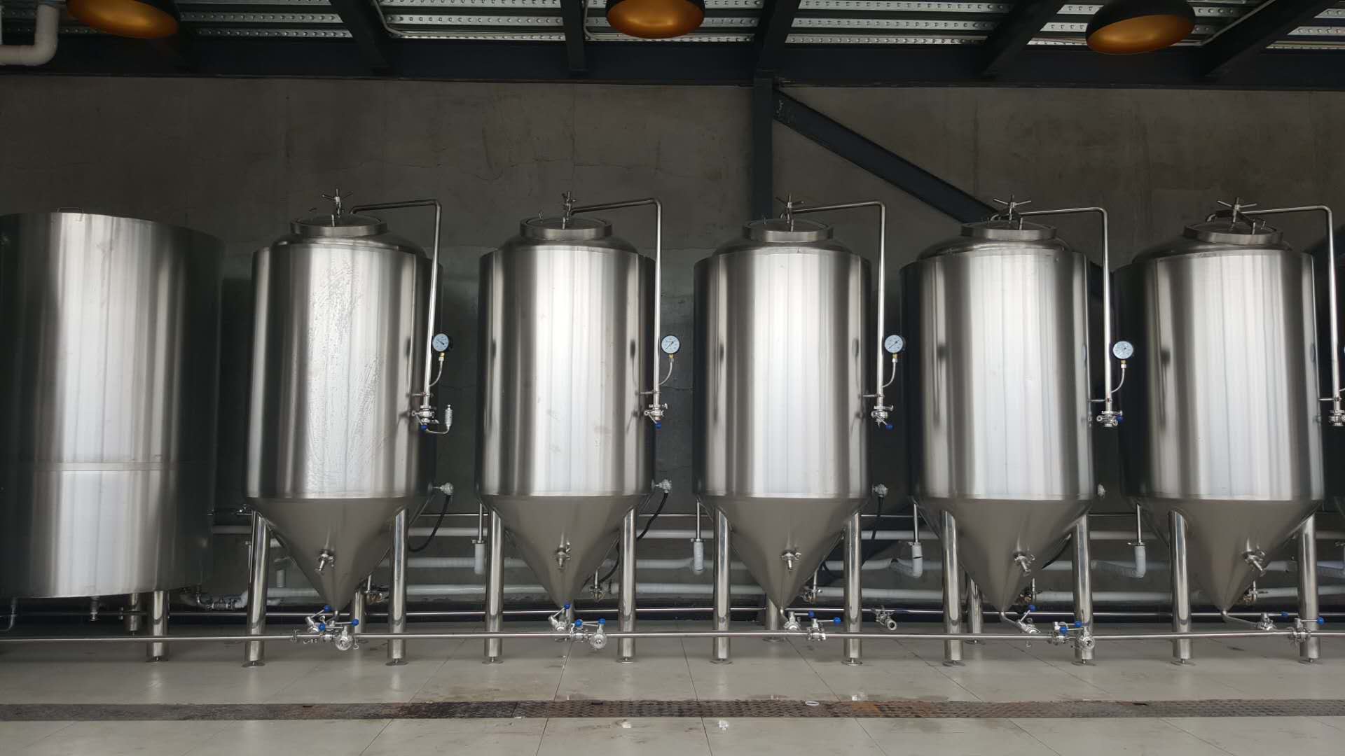 啤酒發(fā)酵系統(tǒng)有發(fā)酵罐、清酒罐、暫存罐組成;發(fā)酵是啤酒生產(chǎn)中極其重要的工藝過(guò)程。是一個(gè)有酵母參與的復(fù)雜的生化反應(yīng)過(guò)程,發(fā)酵罐為錐底圓柱形,罐體具備自身冷卻裝置,可很容易地控制發(fā)酵溫度;罐底為錐形,回收酵母及清洗都很方便;罐體具有CIP清洗系統(tǒng),保證了生產(chǎn)中的衛(wèi)生安全。具備了先進(jìn)的國(guó)際發(fā)酵工程技術(shù),可采用PLC自動(dòng)控溫技術(shù)。全過(guò)程控制啤酒發(fā)酵。